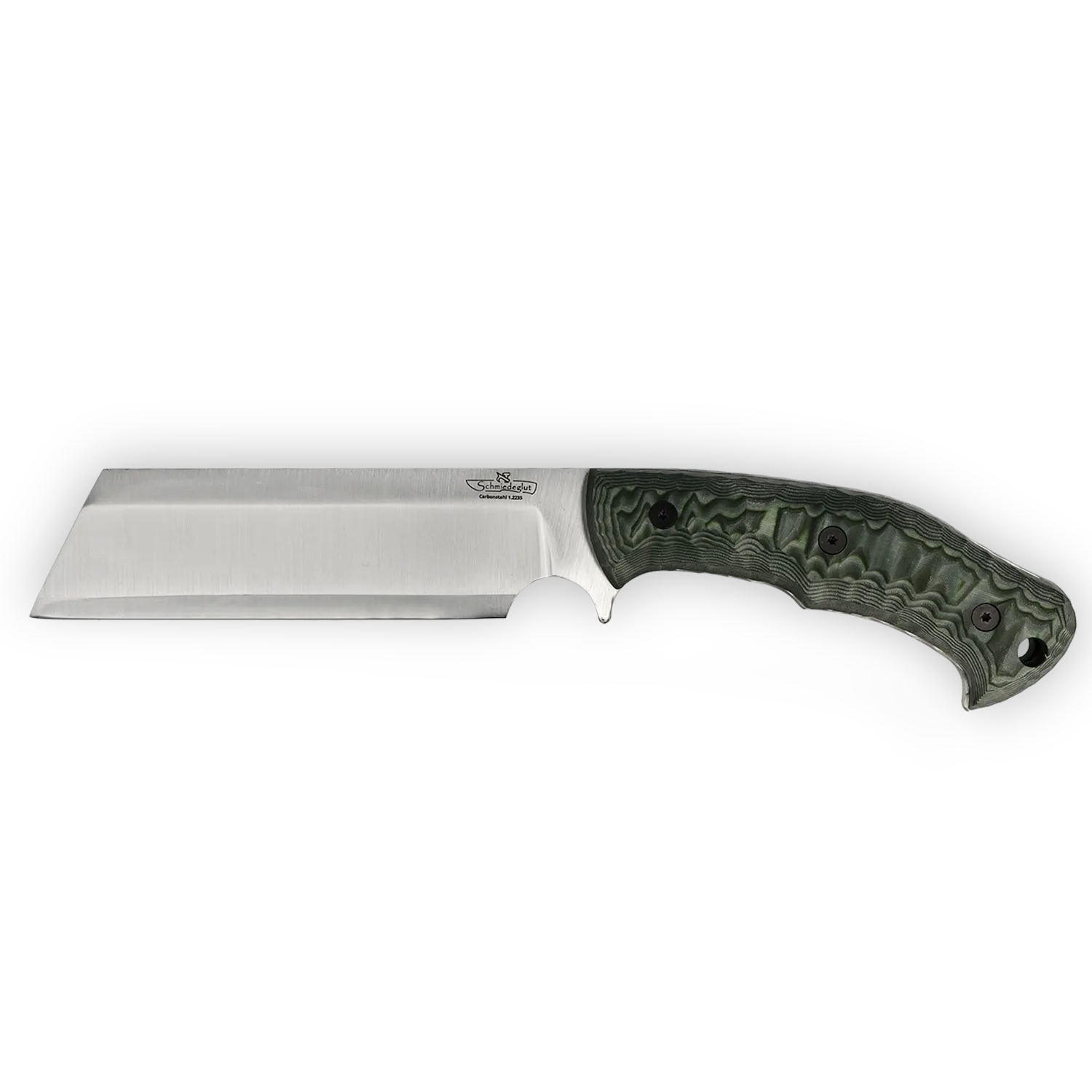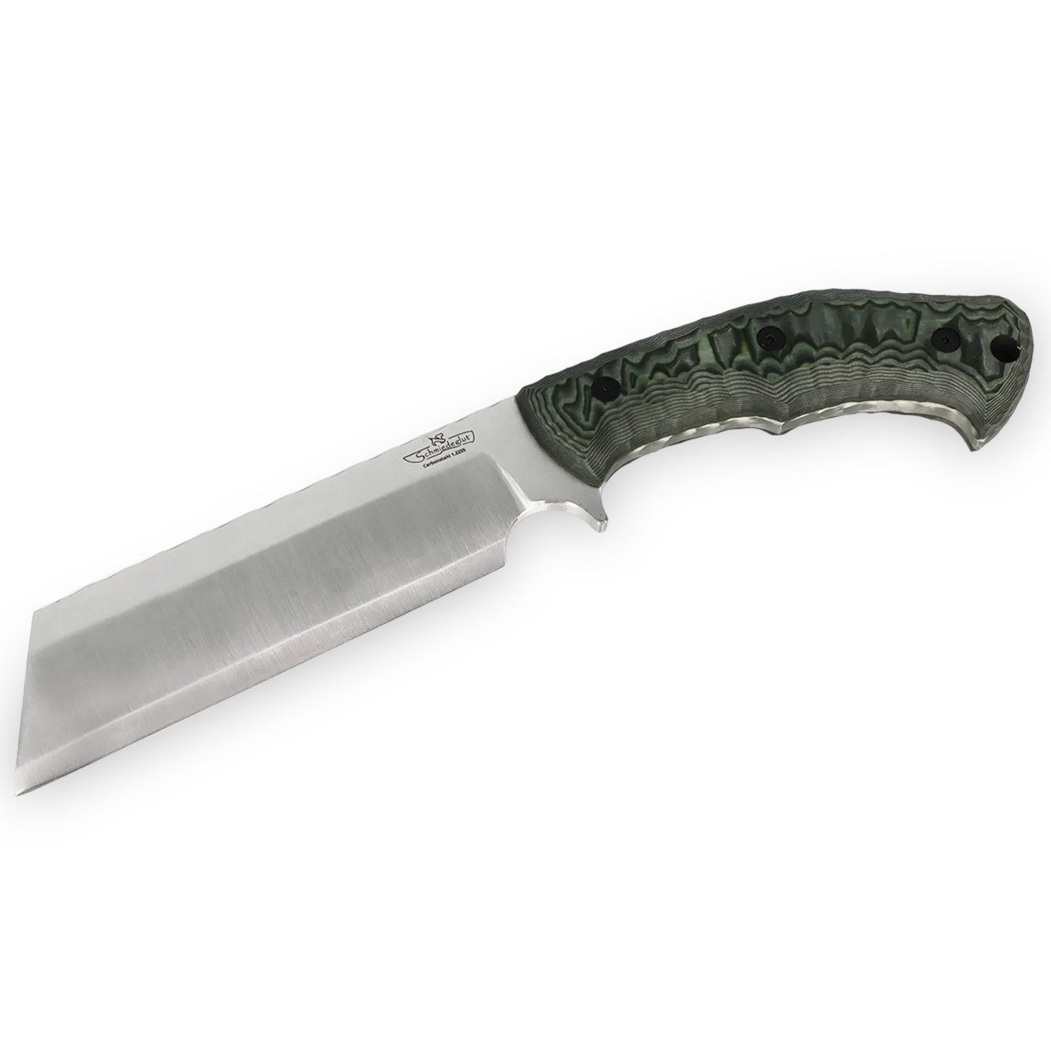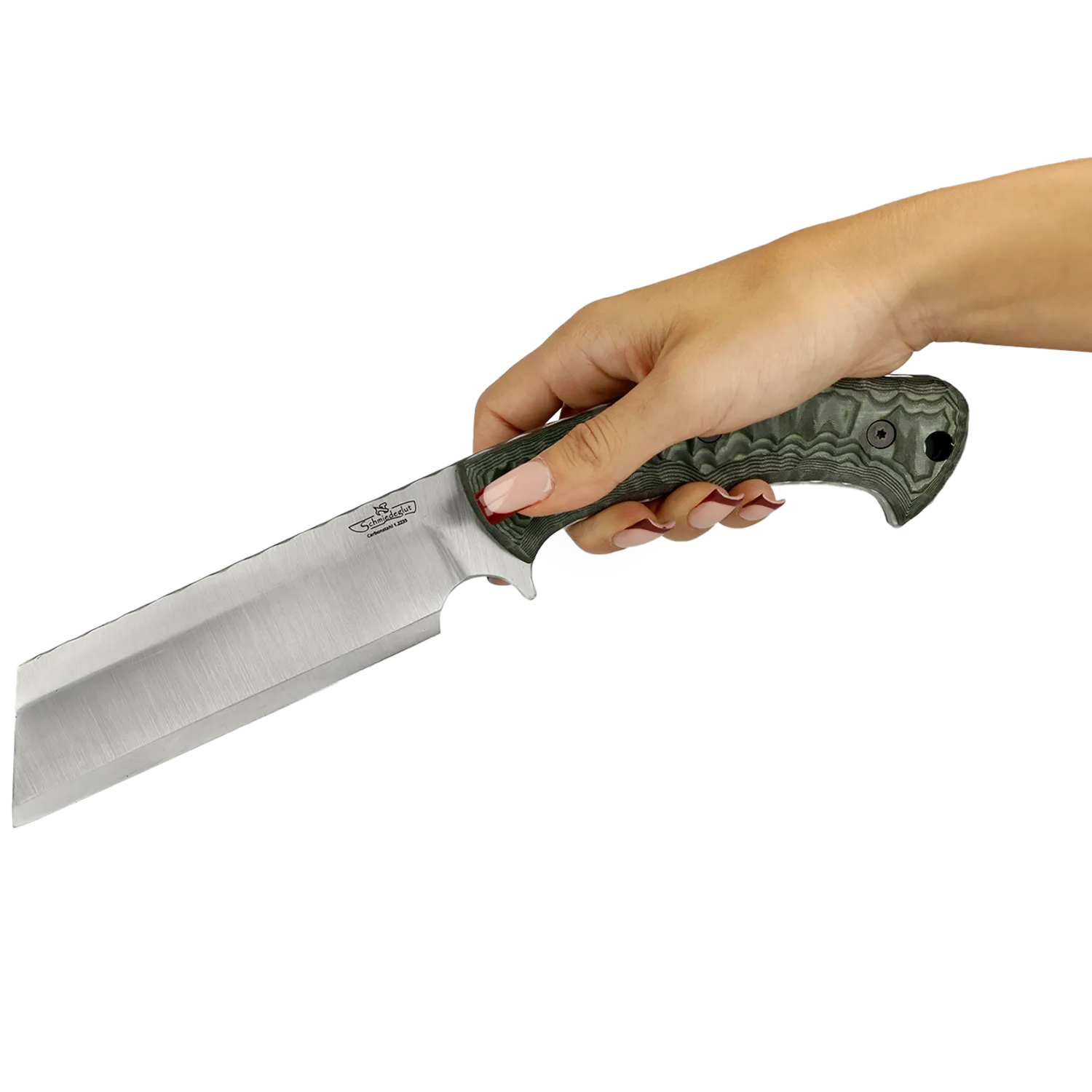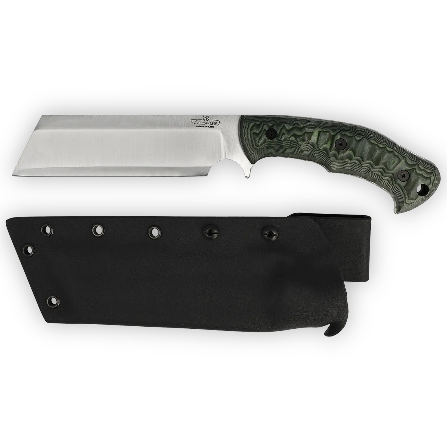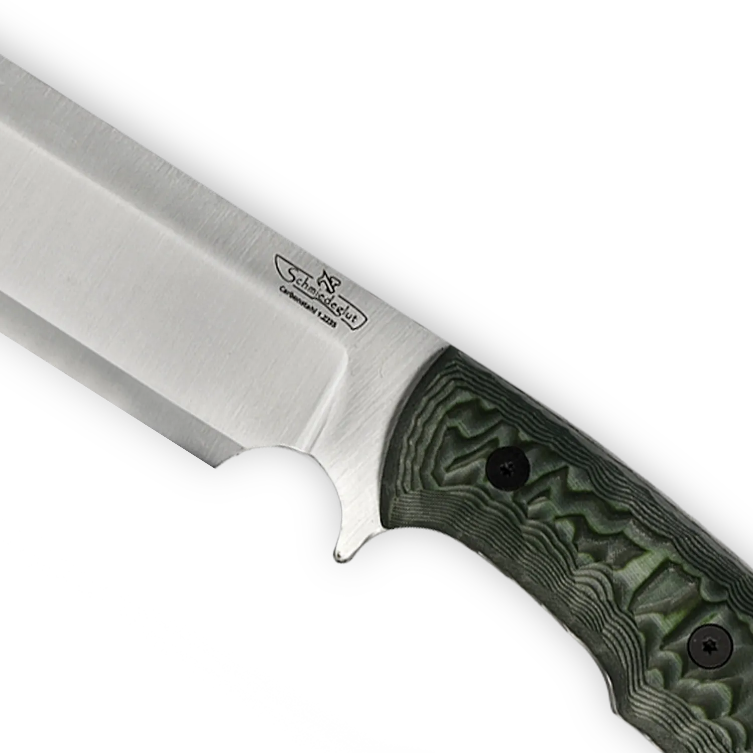 Produktdaten / Lieferumfang: - Klingenstahl: Carbonstahl 1.2235 (nicht rostfrei) - Härte: ca. 60 HRC Rockwell - Klingenfinish: satiniert (Maschinenfinish) - Klingenlänge: ca. 16,5 cm - Klingenhöhe: ca. 4,8 cm - Rückenstärke: ca. 6,0 mm - Grifflänge: ca. 14,0 cm - Griffmaterial: Micarta schwarz-grün mit Rockfinish - Mit schwarzer Kydexscheide und Gürtelhalter - Schärfekategorie B - Inklusive Qualitätsgarantie